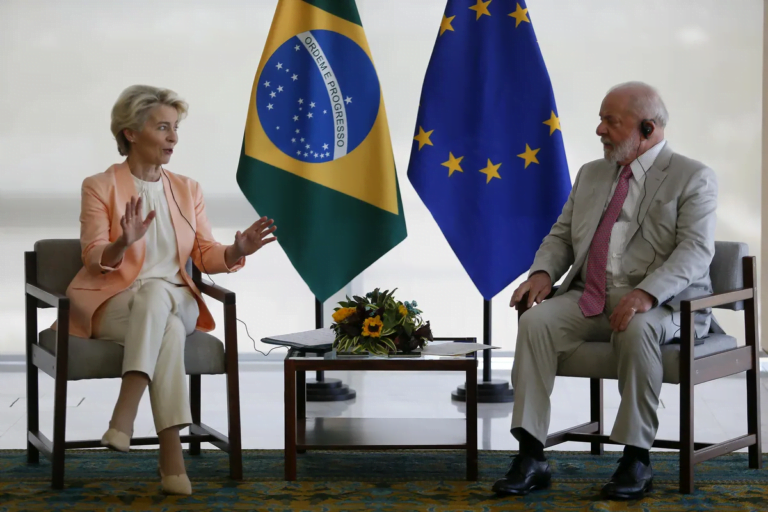 No encontro entre o presidente Luiz Inácio Lula da Silva e a presidente da Comissão Europeia, Ursula von der Leyen, no Palácio do Planalto, em Brasília, as discussões abordam questões globais importantes. Lula enfatizou a importância de soluções diplomáticas para…